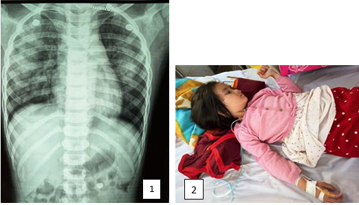 Ảnh: Hình ảnh phổi mờ hình cánh bướm do phù phổi cấp của bệnh nhi Đ (Ảnh 1). và cháu Đ. sau khi cấp cứu ổn định (Ảnh 2)