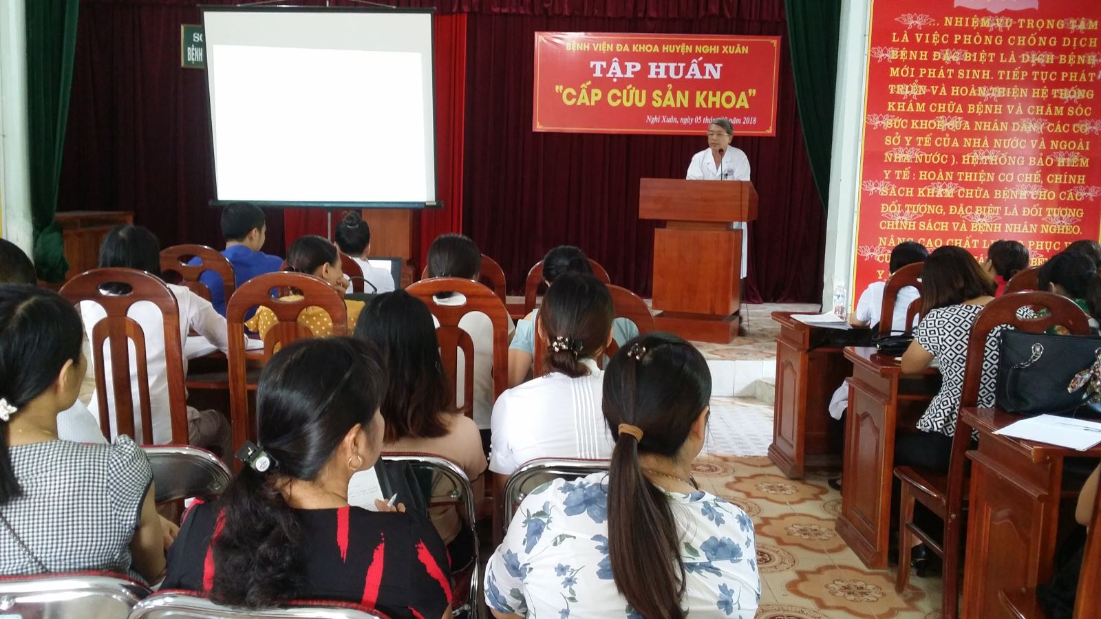 Ngày 5/10/2018, tại bệnh viện đa khoa huyện Nghi Xuân, Bệnh viện kết hợp với TTYT dự phòng của huyện đã tổ chức đợt tập huấn bồi dưỡng chuyên môn cho cán bộ ở các trạm y tế xã, đơn vị nhằm giúp mọi người nhận thức tốt tầm quan trọng của việc chẩn đoán và xử trí tốt các trường hợp nguy cấp như Tiền sản giật và chảy máu sau sinh do trưởng khoa Sản, BSCKI Hoàng Thị Hồng giảng bài.