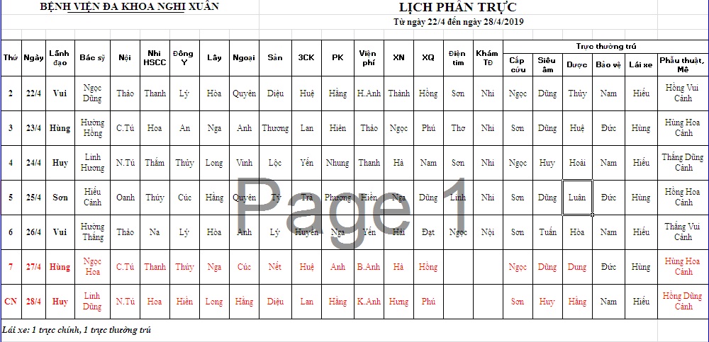 LỊCH TRỰC TỪ 22/04 - 28/04/2019