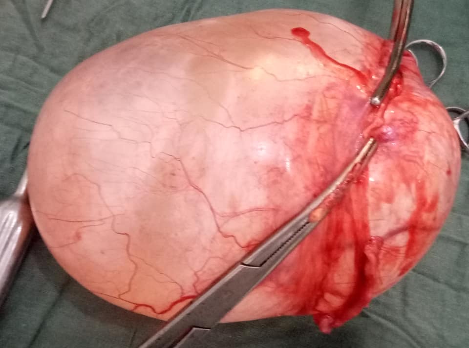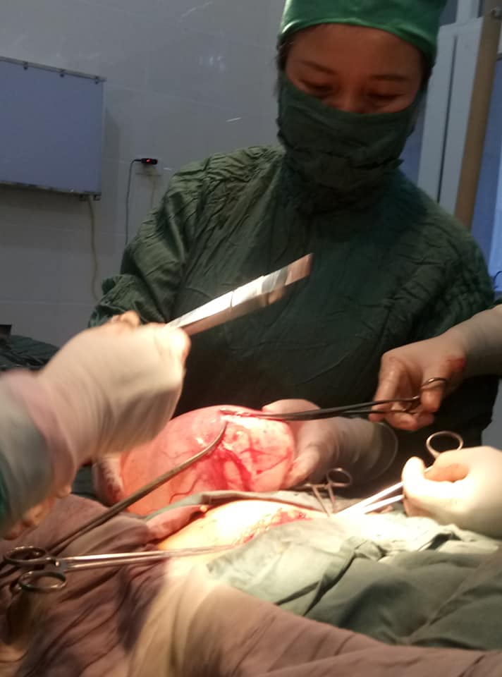 Qua khám lâm sàng, cận lâm sàng . Chị T. được hội chẩn và chẩn đoán Khối U ổ bụng, theo dõi u nang buồng trứng trái. Chỉ định phẫu thuật cắt Khối U . Cuộc phẫu thuật được tiến hành 9h sáng cùng ngày, kíp phẫu thuật gồm: BSCKI. Lê Viết Hùng - PGĐ, BSCKI. Hoàng Thị Hồng - Trưởng Khoa Sản, BS. Lê Thi Phương Hoa cùng kíp gây mê, phụ phẩu thuật đã lấy ra Khối u nang buồng trứng traí nặng 3kg. Trong và sau phẩu thuật bệnh nhân ổn định và chuyển về khoa điều trị.
