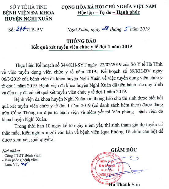 Thực hiện Kế hoạch số 344/KH-SYT ngày 22/02/2019 của Sở Y tế Hà Tĩnh và Kế hoạch số 89/KH-BV ngày 06/03/2019 của Bệnh viện đa khoa huyện Nghi Xuân về việc tuyển dụng viên chức y tế đợt 1 năm 2019