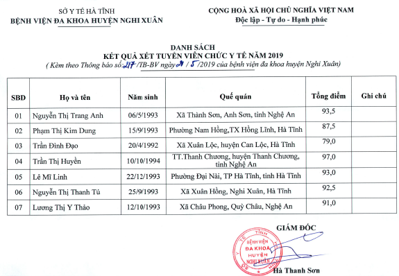 Thông báo kết quả xét tuyển viên chức y tế đợt 1 năm 2019