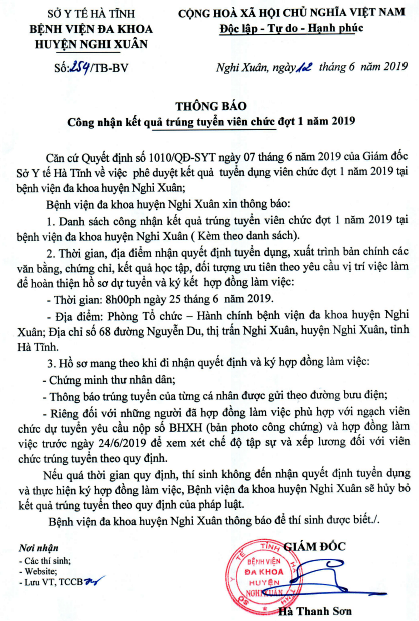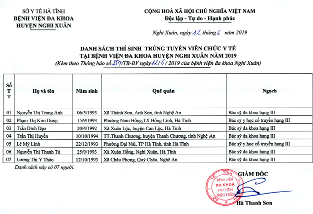 Bệnh viện huyện Nghi Xuân thông báo danh sách trúng tuyển Viên chức đợt 1 năm 2019