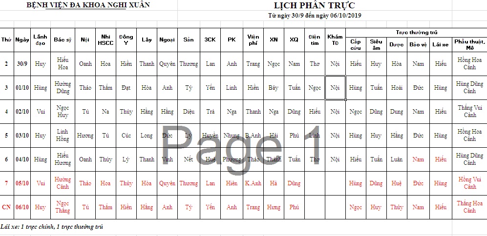 LỊCH TRỰC TỪ 30/9 - 06/10/2019