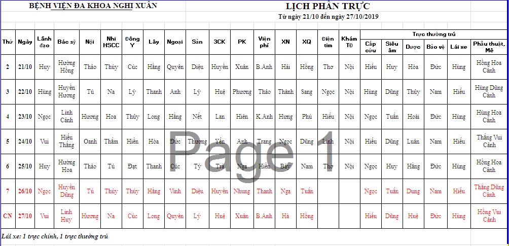 LỊCH TRỰC TỪ 21/10 - 27/10/2019