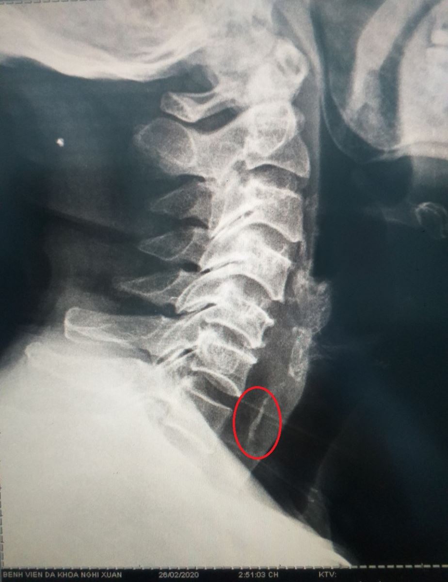 Người nhà đưa bệnh nhân đến bệnh viện đa khoa huyện Nghi Xuân. Khi nhập viện : bệnh nhân tỉnh, nuốt đau, khó nuốt, cảm giác nghẹn thở, dấu hiệu sinh tồn ổn định. Bác sỹ đã chụp X quang vùng cổ ngực thấy hình ảnh dị vật cản quang tương ứng đốt sống cổ VII và chẩn đoán: Dị vật thực quản cổ nghi hóc xương Vịt.