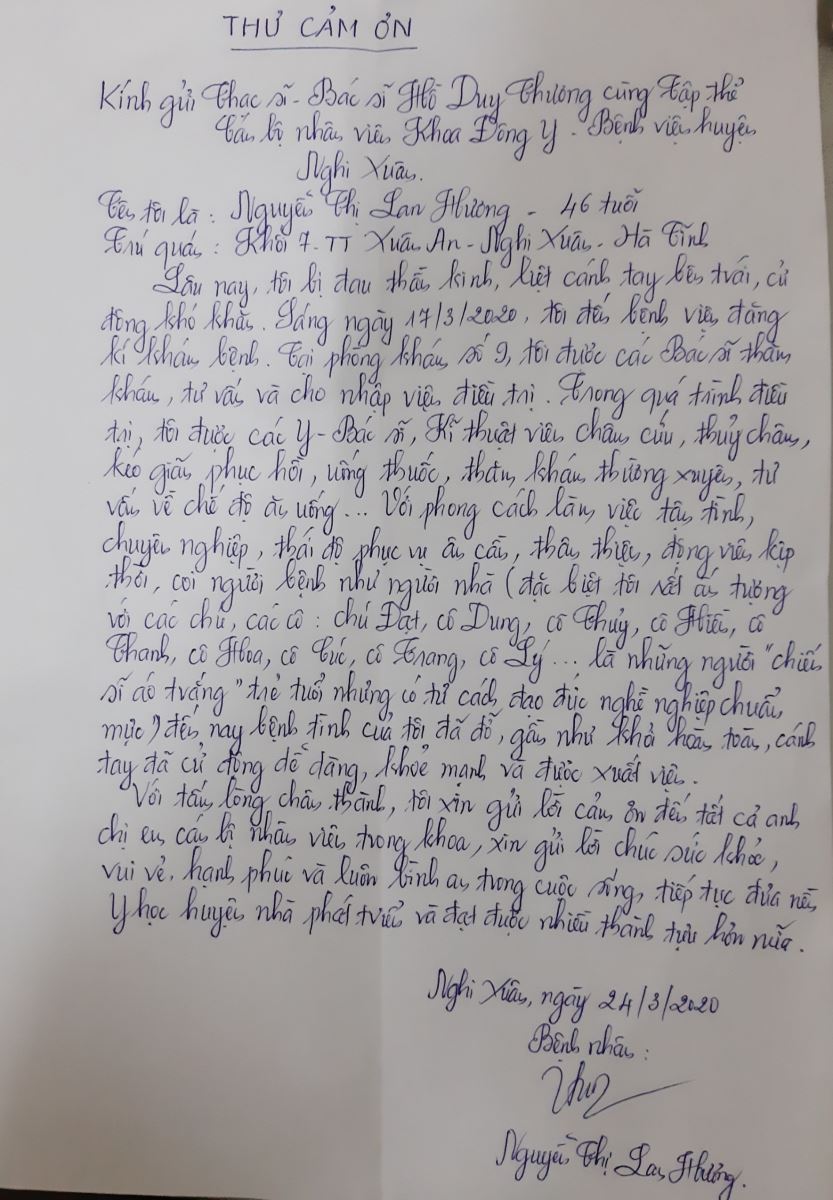 Một trong số những thư khen của bệnh nhân trong tháng 3