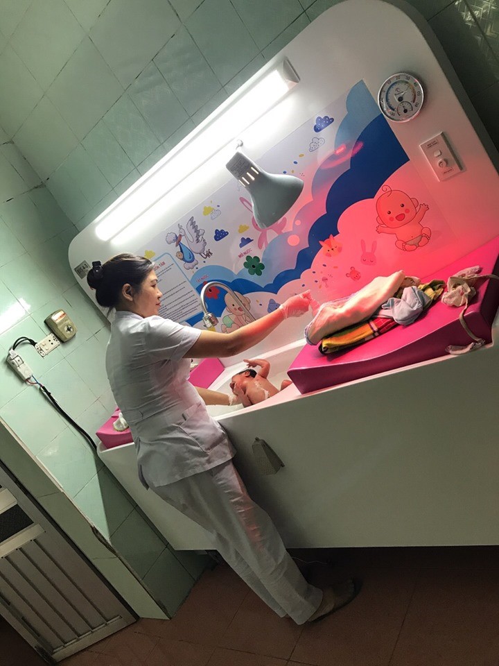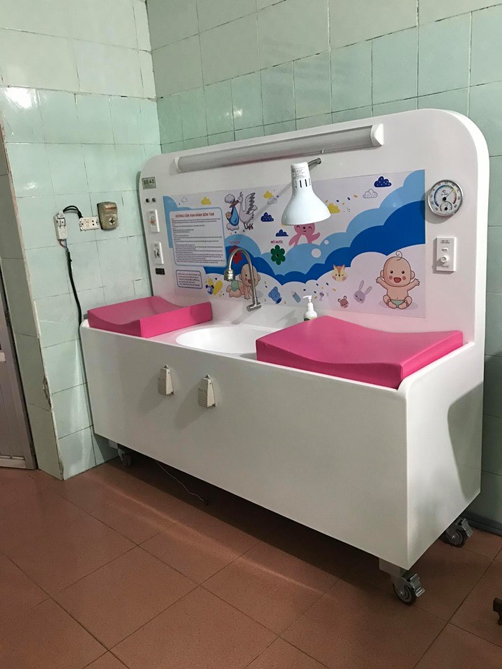Bồn tắm được thiết kể mở, khóa nước bằng cảm ứng, hệ thống đặt nhiệt độ hiện đại, và hệ thống đèn sưởi đảm bảo đủ sáng, đủ ấm cho không gian tắm bé mang lại cảm giác an toàn và thân thiện cho mỗi người bệnh khi đến điều trị tại khoa