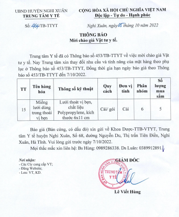 | TRUNG TÂM Y TẾ HUYỆN NGHI XUÂN THÔNG BÁO MỜI CHÀO GIÁ VẬT TƯ Y TẾ