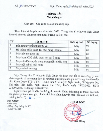 TRUNG TÂM Y TẾ HUYỆN NGHI XUÂN THÔNG BÁO MỜI CHÀO GIÁ THIẾT BỊ Y TẾ