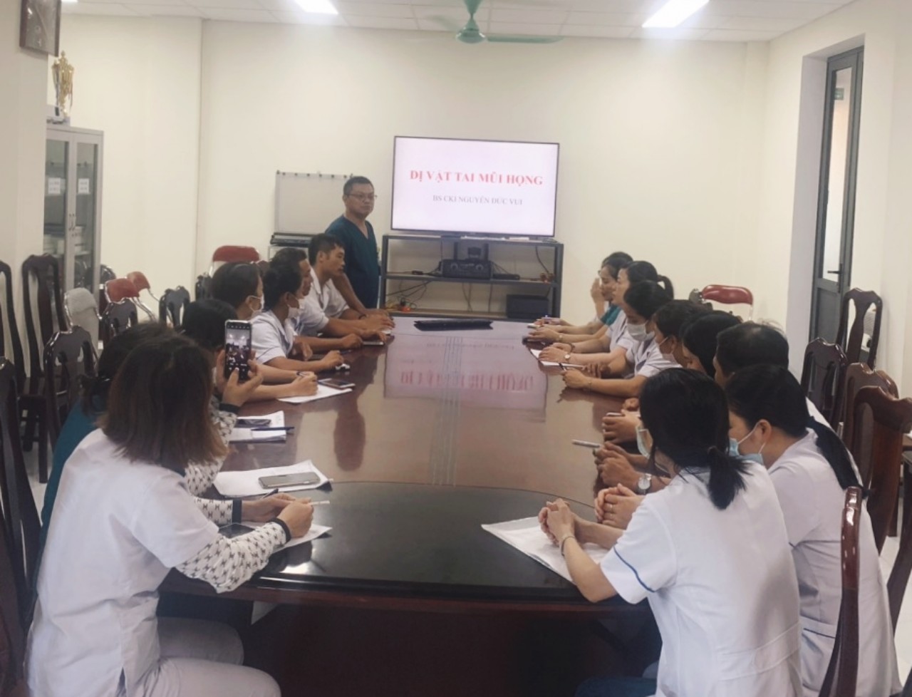Tại buổi tập huấn, các học viên đã được BsCKI.Nguyễn Đức Vui trao đổi các nội dung: Nguyên nhân, chẩn đoán, xử trí dị vật tai mũi họng và bệnh viêm tai giữa cấp.
