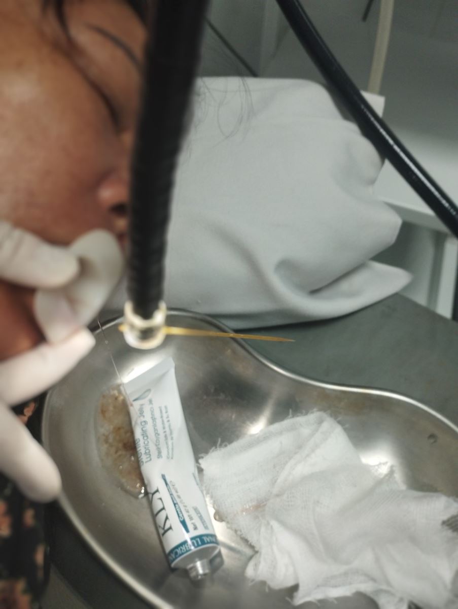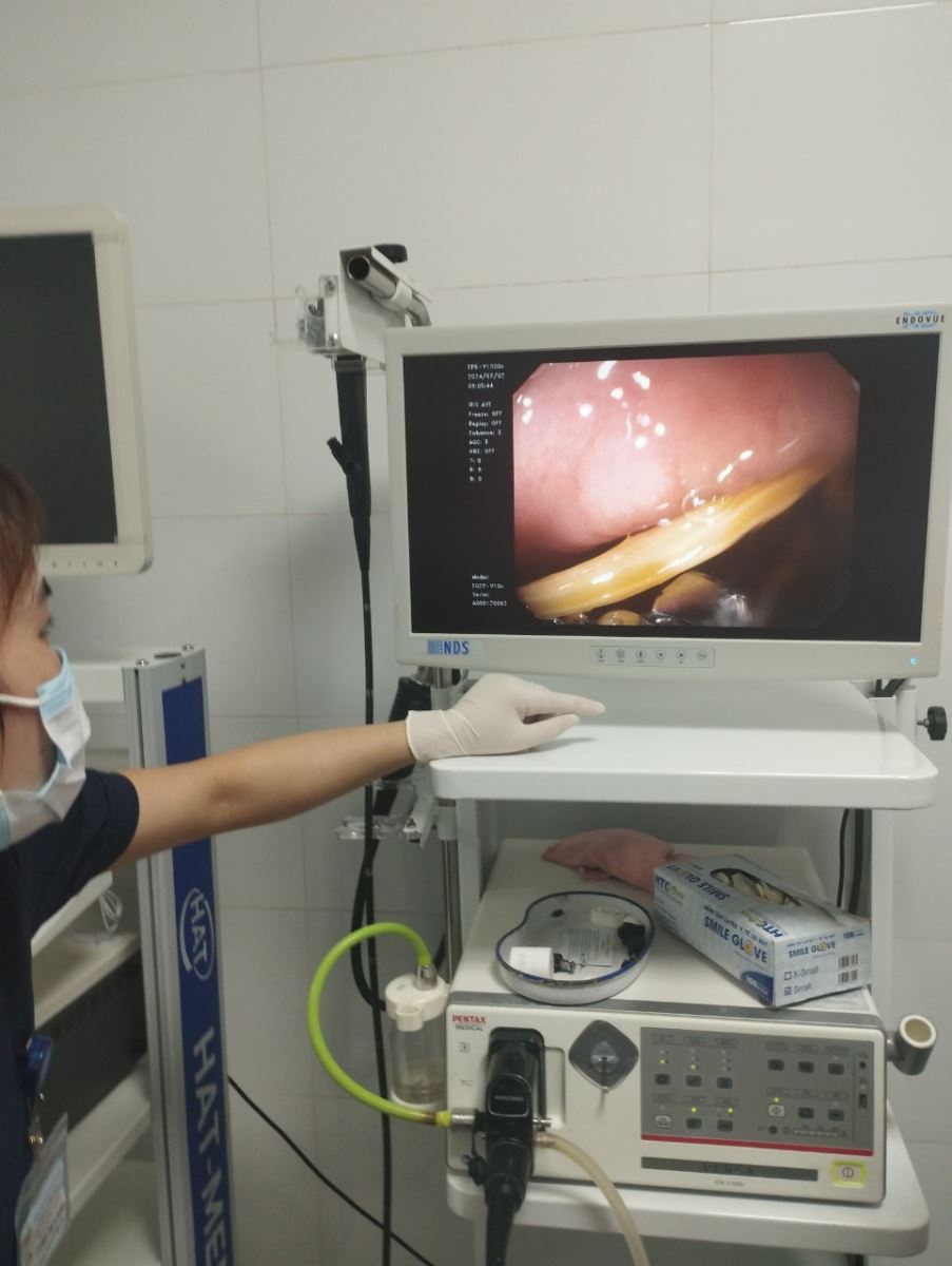 Bệnh nhân vào viện với chấn đoán dị vật dạ dày – thực quản, qua thăm khám được Bác sỹ tư vấn gây mê nội soi lấy dị vật. Sau 20 phút kíp nội soi- gây mê đã tiến hành Hội chấn, chỉ định gây mê nội soi lấy dị vật bằng ống mềm. Công việc đã chuẩn bị sẵn sàng, bệnh nhân được chuyển lên phòng nội soi Tiêu hoá. Kíp gây mê và nội soi đã tiến hành thủ thuật lấy dị vật 7cm 2 đầu nhọn (tăm tre). Kíp gây mê và nội soi bao gồm Bác sỹ Trần Thanh Cảnh, Bs Bùi Thị Quỳnh Thơ, Bs Lương Thị Y Thảo, Đặng Duy Anh, Phan Thị Hải Yến.