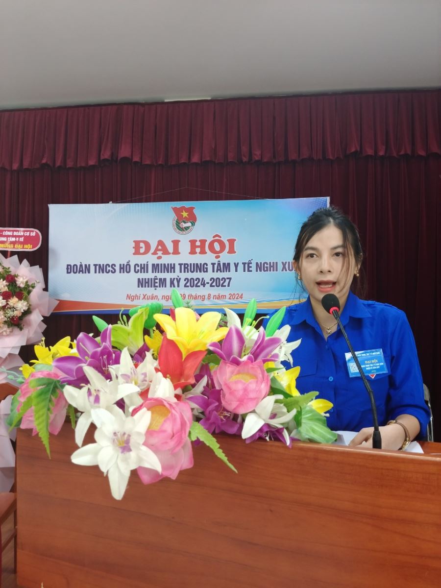 Về dự Đại hội chi đoàn của Trung tâm y tế huyện Nghi Xuân, Bí thư huyện Đoàn phát biểu tại Đại hội ghi nhận, biểu dương những kết quả của đoàn viên Chi đoàn Trung tâm Y tế; đồng thời nêu lên một số nhiệm vụ trọng tâm trong công tác trong thời gian tới, tiên phong, đoàn kết, sáng tạo, phát triển của tuổi trẻ BCH Chi đoàn Trung tâm Y tế nhiệm kỳ 2024 – 2027 và các đồng chí Đoàn viên sẽ hoàn thành xuất sắc sứ mệnh chính trị được tổ chức giao phó. Bên cạnh đó, các đoàn viên, thanh niên cần thực hiện tốt mục tiêu nhiệm vụ về Y tế nâng cao chất lượng khám chữa bệnh và công tác chăm sóc sức khỏe nhân dân.