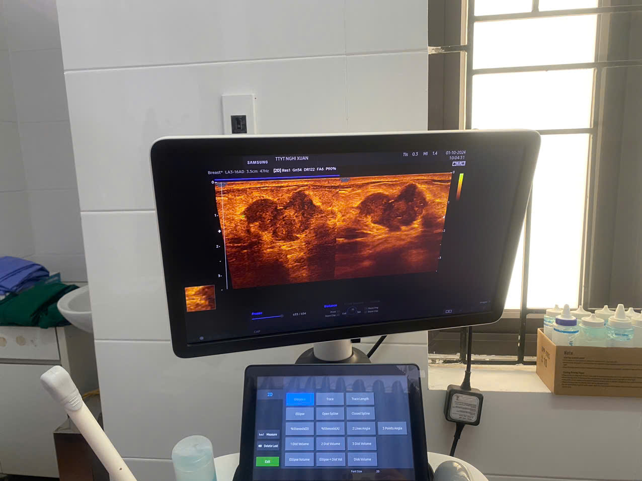 Sáng ngày 1/10/2024 Bệnh nhân Đậu Thị H, 65 tuổi, ở xã Xuân Mỹ đến tại Trung tâm Y tế huyện Nghi Xuân trong tình trạng kêu đau vú, đau ngực khó thở. Sau khi được Bác sỹ thăm khám và siêu âm cho kết quả là các ống tuyến không giãn, vị trí 15 giờ cách núm vú 1cm có khối giảm âm không đồng nhất bờ đa cung kích thước 24,6x15,9mm có nhiều nối vi vôi hóa trung tâm.( Kết luận: U vú trái, Đề nghị sinh thiết tế bào ).
