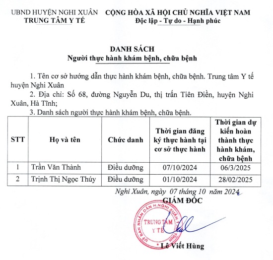 Danh sách người thực hành khám bệnh, chữa bệnh tại Trung tâm y tế huyện Nghi Xuân