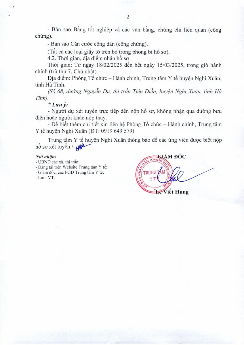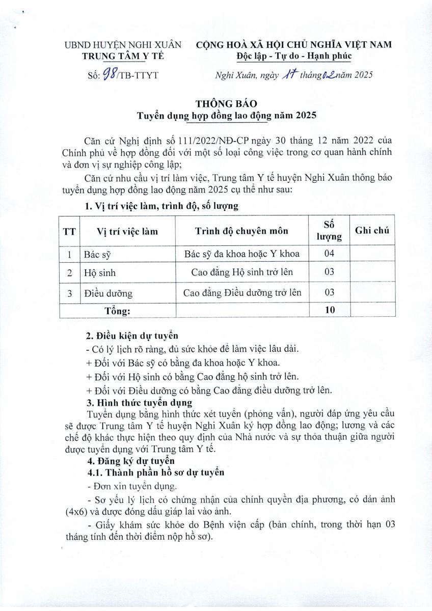 Trung tâm y tế huyện Nghi Xuân thông báo tuyển dụng hợp đồng lao động làm việc tại Trung tâm y tế
