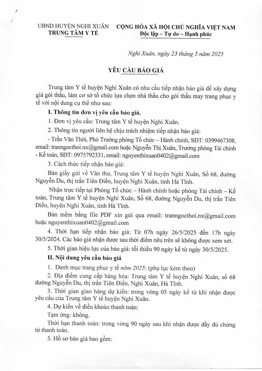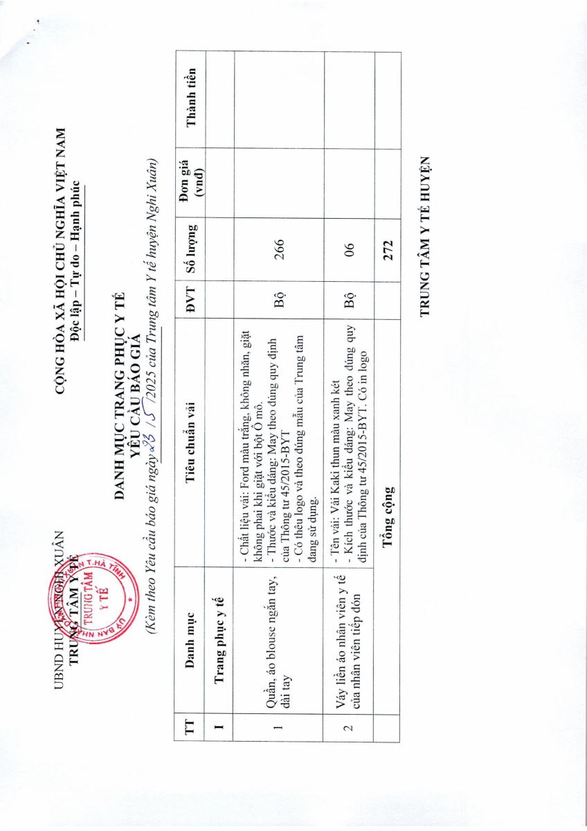 Trung tâm y tế huyện Nghi Xuân có nhu cầu tiếp nhận báo giá để xây dựng giá gói thầu, làm căn cứ lựa chọn nhà thầu cho gói thầu may trang phục y tế.
