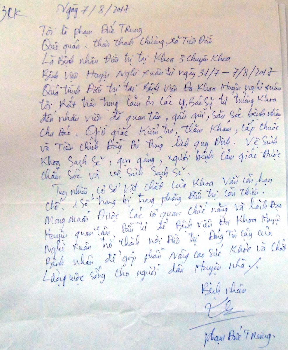 Tôi nhập viện và điều trị ở khoa 3 chuyên khoa bệnh viện đa khoa huyện Nghi Xuân từ ngày 31/7/2017 đến 07/8/2017, trong quá trình điều trị tôi rất trân trọng và cảm ơn các y, bác sĩ từ trưởng khoa đến nhân viên đã quan tâm, gần gũi để chăm sóc bệnh nhân chu đáo, giờ giấc kiểm tra thăm khám, cấp thuốc và tiêm chích đầy đủ đúng lịch quy định. Vệ sinh khoa sạch sẽ, gọn gàng, người bệnh cảm giác được vệ sinh và chăm sóc sạch sẽ.